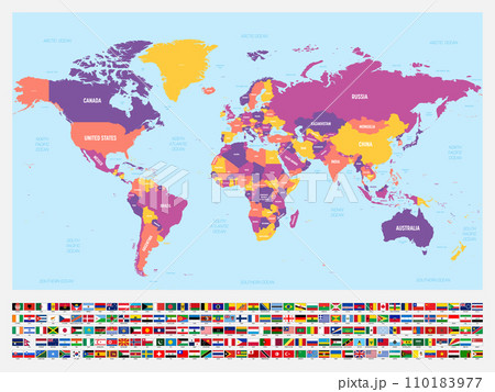 Colored political map of World with country and water labels. With set of national flags of countries under the map. Vector illustration.