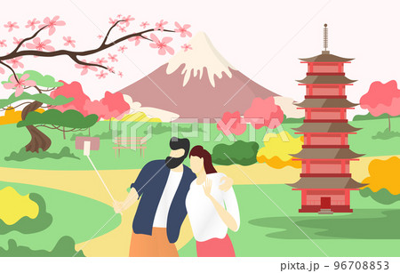 European lovely couple make selfie photo japan asian style temple, landscape mount fuji flat vector illustration, isolated on white.