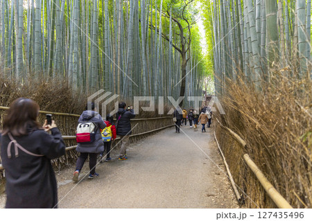 Kyoto, Japan - Jan 1,2023 : People walking in the aisle of Bamboo Forest of the Arashiyama Bamboo Grove in Kyoto, Japan on Jan 1,2023.