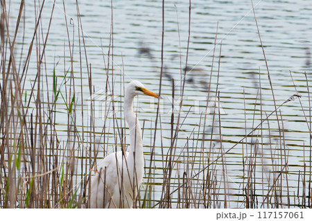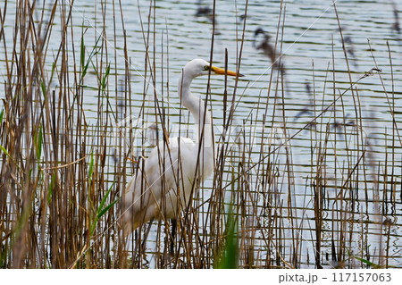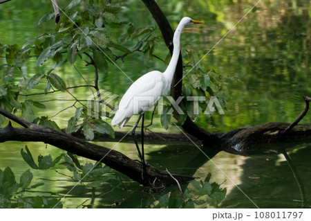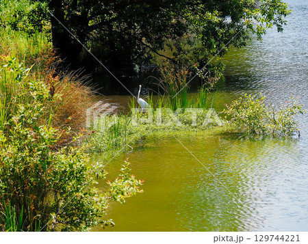 獲物を狙う水辺のサギ科ダイサギ