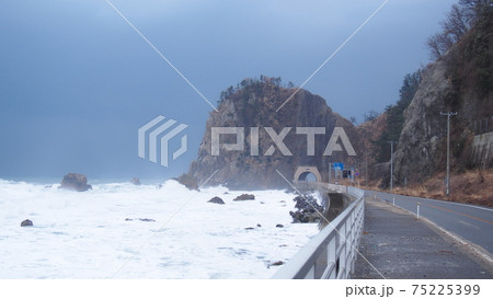 海里より車窓を望む 鷹巣岩 鷹ノ巣岩 屏風岩 村上市板貝 日本海