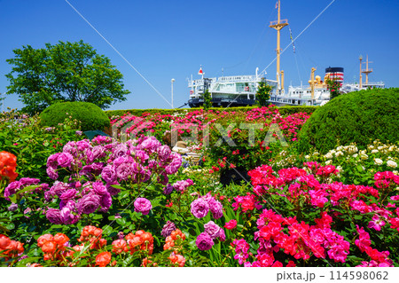 (神奈川県)横浜市・山下公園 満開のバラの向こうに氷川丸