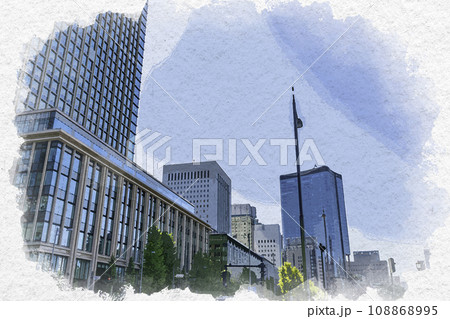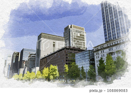 水彩画風 東京丸の内 馬場先濠沿いのビル群 東京都千代田区