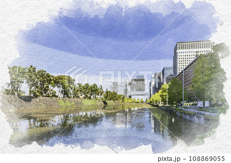 水彩画風 東京丸の内 日比谷濠沿いのビル群 東京都千代田区
