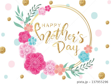 3D立體花朵與金色圓框,母親節橫幅廣告海報宣傳單向量素材,也適用婦女節、情人節、紀念日、週年、婚禮