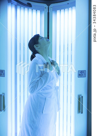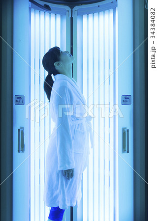 Woman leaves solarium at SPA center, having enjoyed procedure with ultraviolet rays