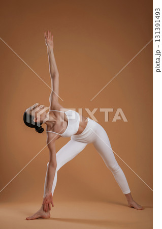 Leg is high up, good stretching. Beautiful fitness woman is in the studio
