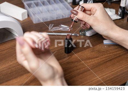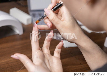 Woman performing her own personal manicure, carefully holding brown gel polish brush, demonstrating at-home self-care, beauty, and creative nail art