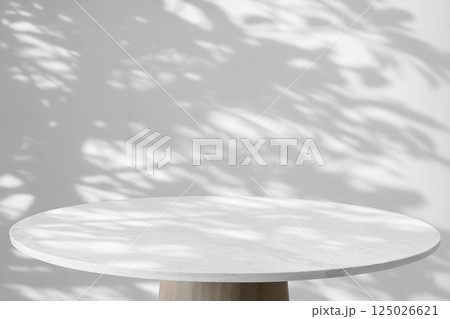 Round marble table top with tree leaves shadow drop on white wall background for mockup product display