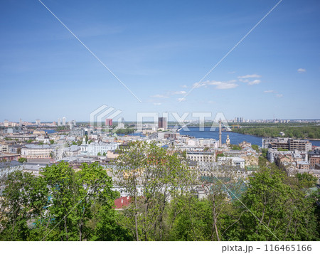 【ウクライナ】首都キーウのウッドデッキの展望台から望む旧市街ポジールの眺めと快晴の青空