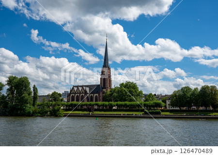 Frankfurt Cathedral and City at Evening Twilight. Aerial View. Hesse, Germany