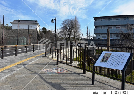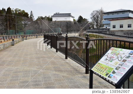 三重県 亀山城跡の池の側(外堀)沿い遊歩道と旧亀山城多聞櫓と観光案内板