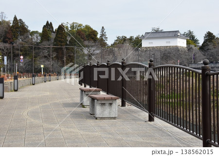 三重県 亀山城跡の池の側(外堀)と遊歩道と旧亀山城多聞櫓