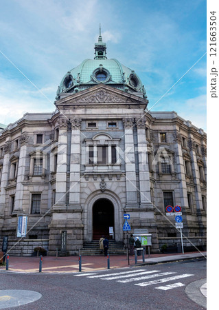 青空を背景に神戸の都市風景、みなと元町駅(辰野金吾が設計した旧第一銀行神戸支店)