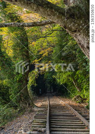 日本 鳥取県倉吉市関金町にある旧国鉄倉吉線、泰久寺駅の廃線跡の線路と紅葉した木々