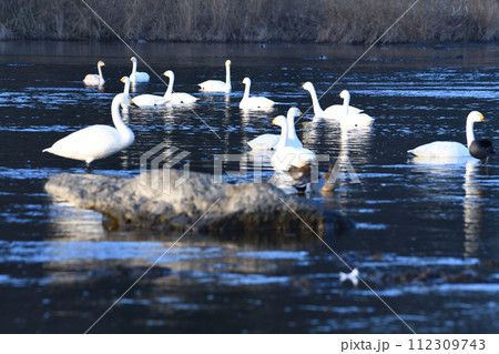 早朝の荒川本流に越冬するコハクチョウの 深谷市 旧川本地区