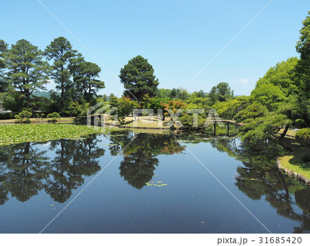 衆楽園のスイレンの花咲く池と木橋と茶室・風月軒 岡山県津山市