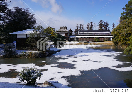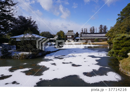 うっすら雪が積もった池のある庭園。岡山県津山市、大名庭園「衆楽園」
