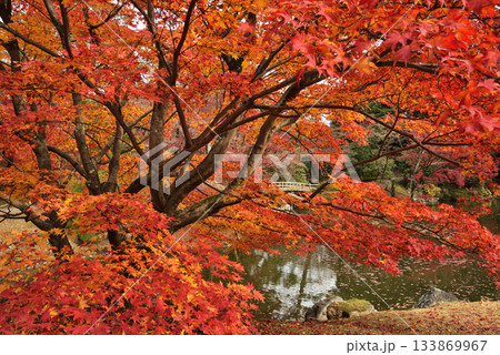 京都仙洞御所 南池のモミジと紅葉橋(京都市上京区)