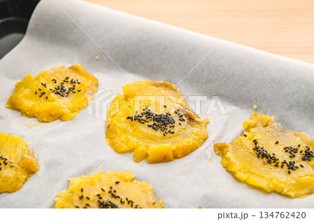 押し付けた蜜芋にバターを塗ってゴマをのせる