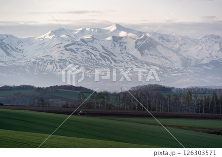 農作業中 赤城高原畑からの眺め 上越の雪山 昭和村