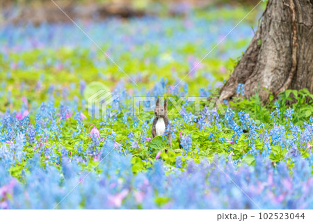 ファンタジーのようなメルヘン花畑のエゾリス 北海道浦臼神社