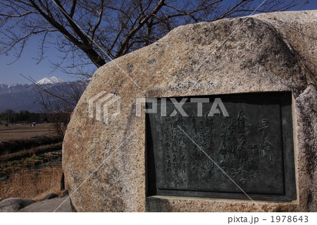 信州 安曇野 早春賦歌碑公園の桜と有明山 眺めの良い安曇野の堤防沿いにある