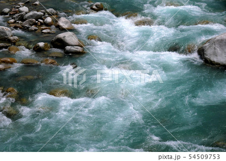 北アルプスの剱岳から流れる雪解け水流がすがすがしい春の早月川