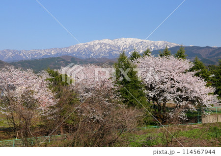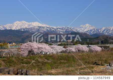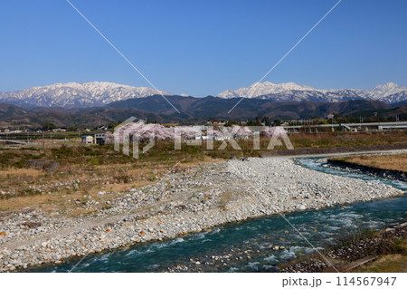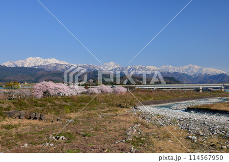 富山県魚津市吉野 早月川にかかる延槻大橋からの早月川緑地多目的広場の桜並木と冠雪の飛騨山脈北アルプス