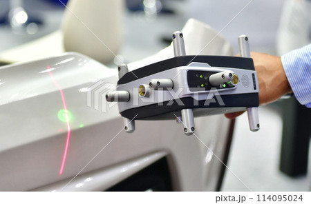 Hand-held 3D laser scanners measure the accuracy of automotive parts. in industrial plants, copy space