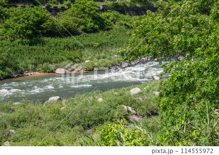 吹割の滝上流 千畳敷 浮島 吹割れ渓谷 初夏の風景