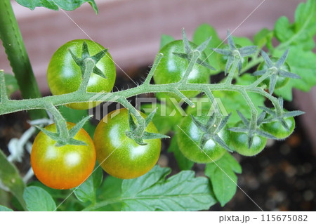 家庭菜園で育てる実りたての青いミニトマト