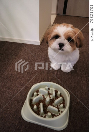 食欲旺盛なシーズー(犬)がごはんを前に待てをする可愛い姿