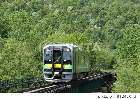 石狩川を渡る石北本線普通列車列車 JR北海道一般形気動車 H100 DECMO