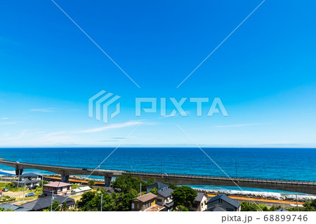 (茨城県-風景パノラマ)高台から見渡す高架橋と太平洋1