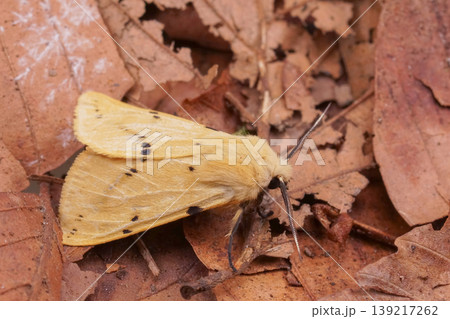 Closeup on the yellow European buff ermine owlet moth, Spilosoma lutea on forest floor