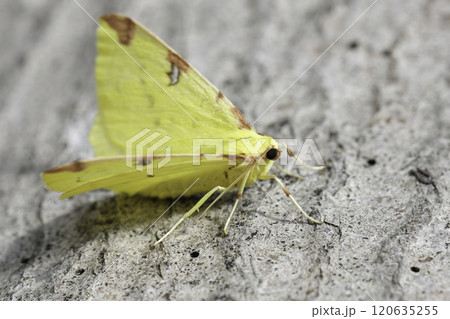 Closeup on the colorful European yellow Brimstone Moth geometer moth, Opisthograptis luteolat sitting on wood