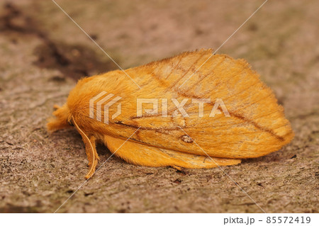 Closeup on a yellow hairy female Drinker moth, Euthrix potatoria siting on a piece of wood