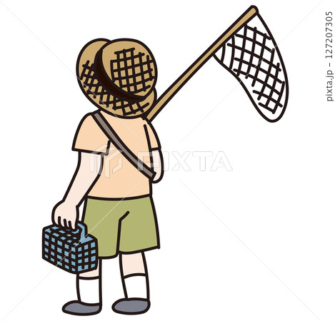 虫取り網と虫かごを持った元気な男の子のイラスト