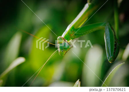 カマキリが前足に備わった巨大な鎌で蝉を捕まえて捕食しょうとする生態写真