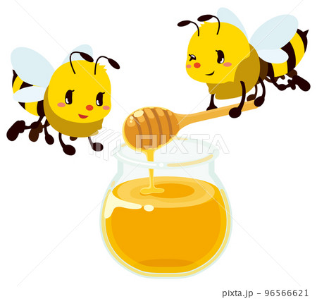 美味しそうな瓶入りハチミツと可愛いみつばち