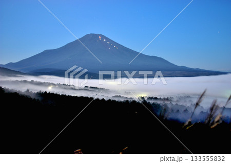 山梨県南都留郡忍野村二十曲峠より朝霧のかかった山中湖町と富士山