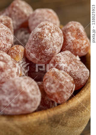 small orange fruits of fragrant kumquat dried in sugar , food details, round dehydrated kumquat fruit in a wooden bowl