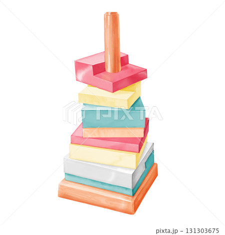 Multicolored assembled pyramid. Hand-drawn children's toys. Watercolor illustration on a white background. For the design of children's cards, educational games, stickers, web pages, decor.