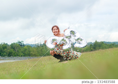 Outdoors, young biracial girl smiling brightly, wearing colorful floral dress