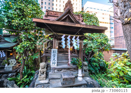 日本の東京都市景観 東京・秋葉原の柳森神社(通称=倉稲魂大社)。狐や狸…、摂社・末社…=神田須田町