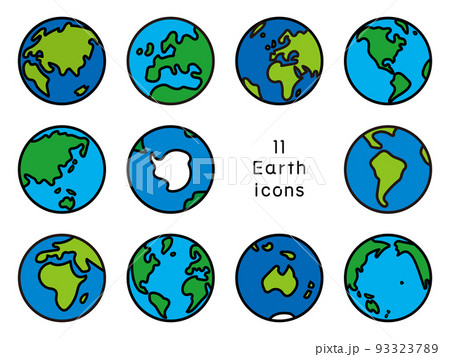 シンプルな地球のアイコンセット、単純化した線画、青い地球