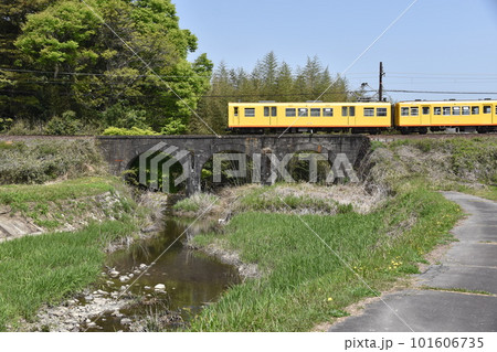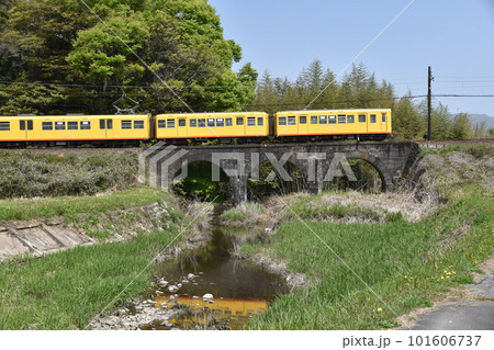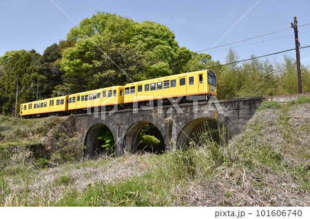 三重県いなべ市のめがね橋を通り過ぎる三岐鉄道北勢線の黄色い軽便鉄道