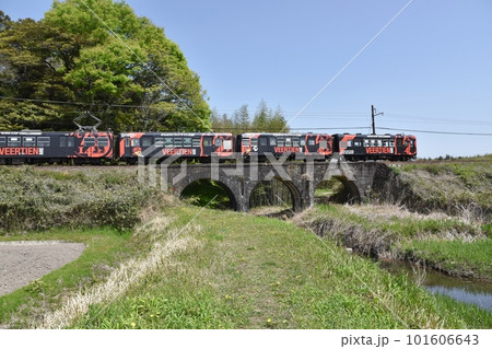 めがね橋を渡る三岐鉄道・北勢線の270系ナローゲージ列車
