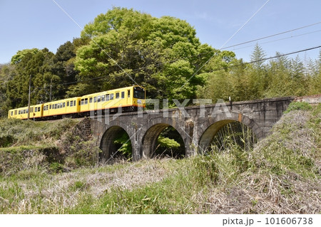 三重県いなべ市のめがね橋を通り過ぎる三岐鉄道北勢線の黄色い軽便鉄道